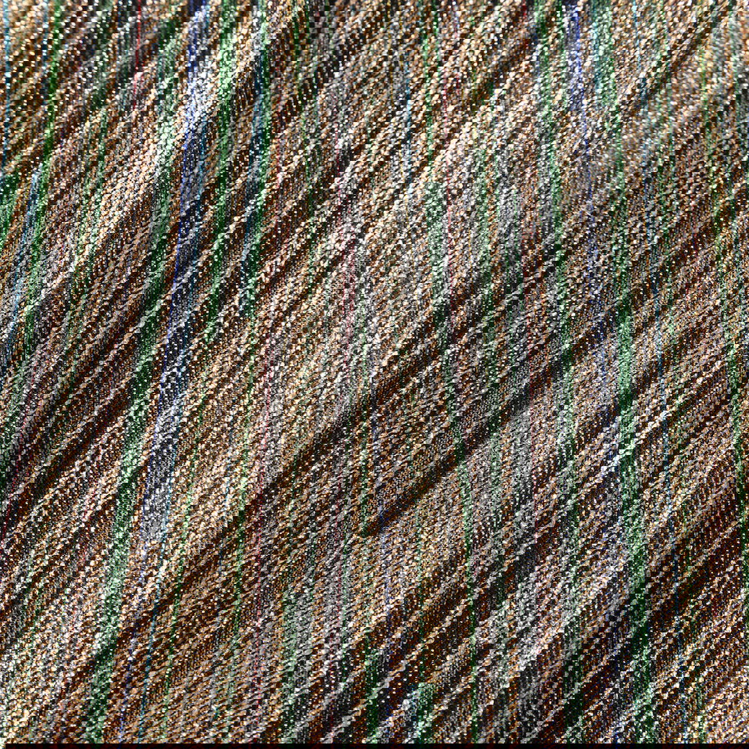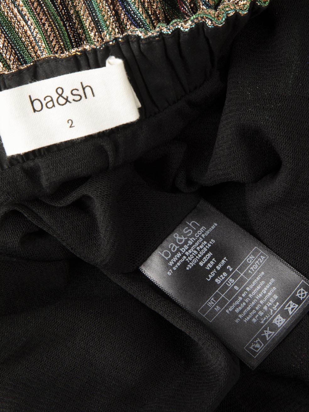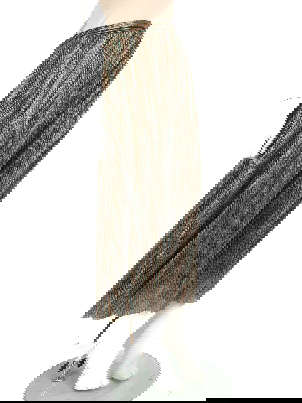 Multicolour metallized fiber midi skirt in excellent, pre-loved condition. With striped pattern, elasticated waistband and side zip fastening. Composition: 53% Metallized fiber, 47% Polyester. Hand wash only. Waist: 35 cm Hip: 57 cm Length: 92 cm