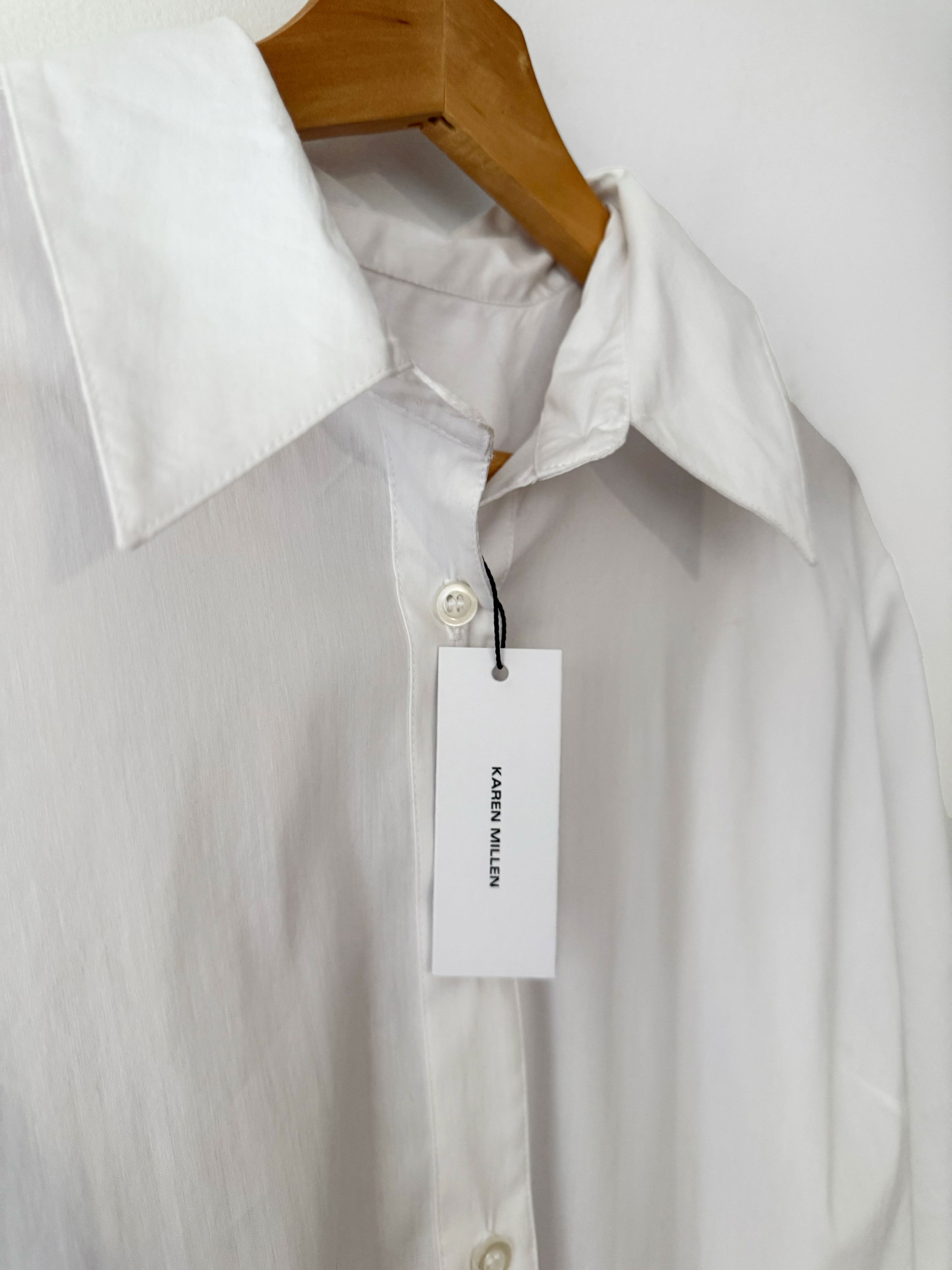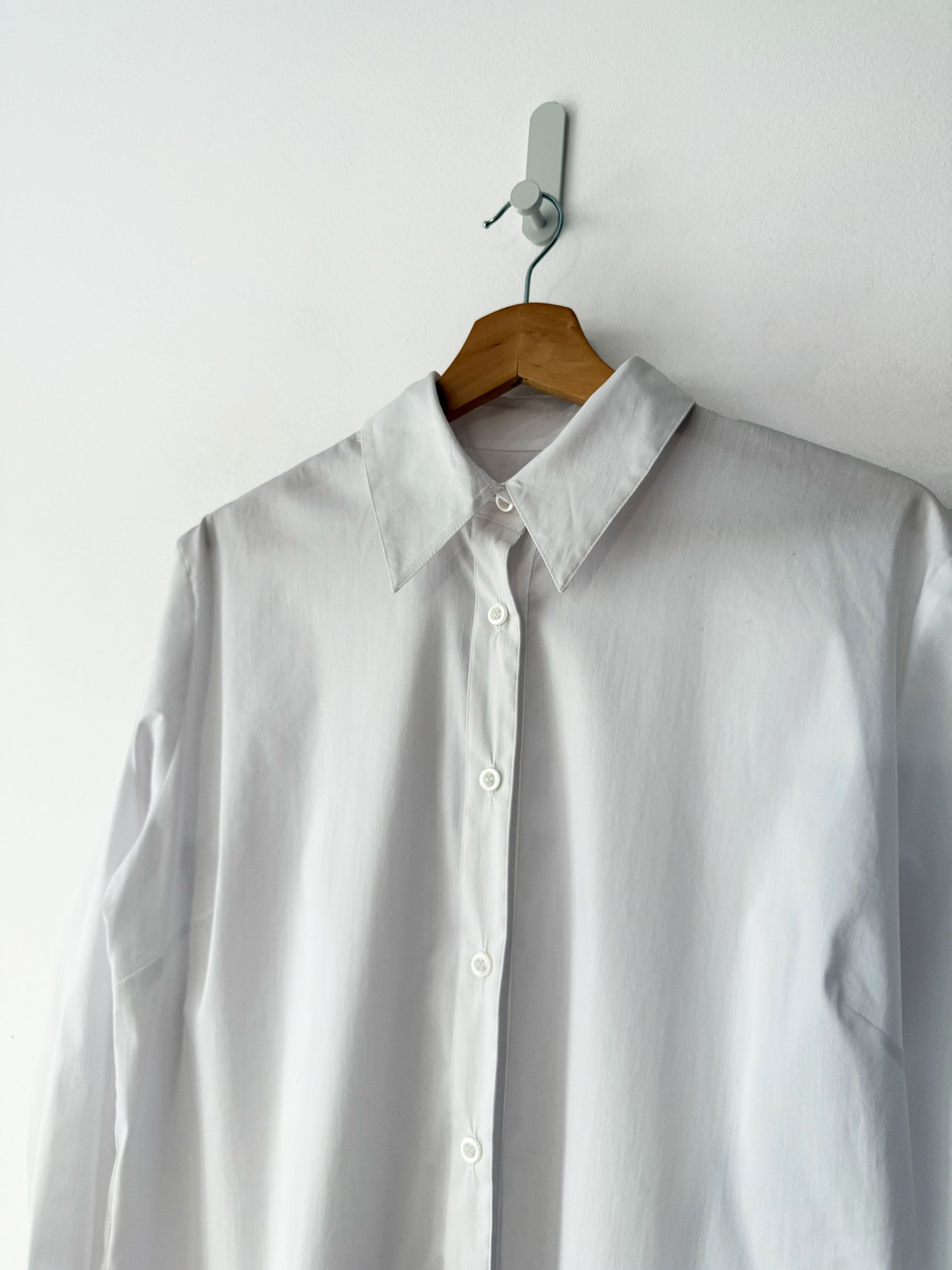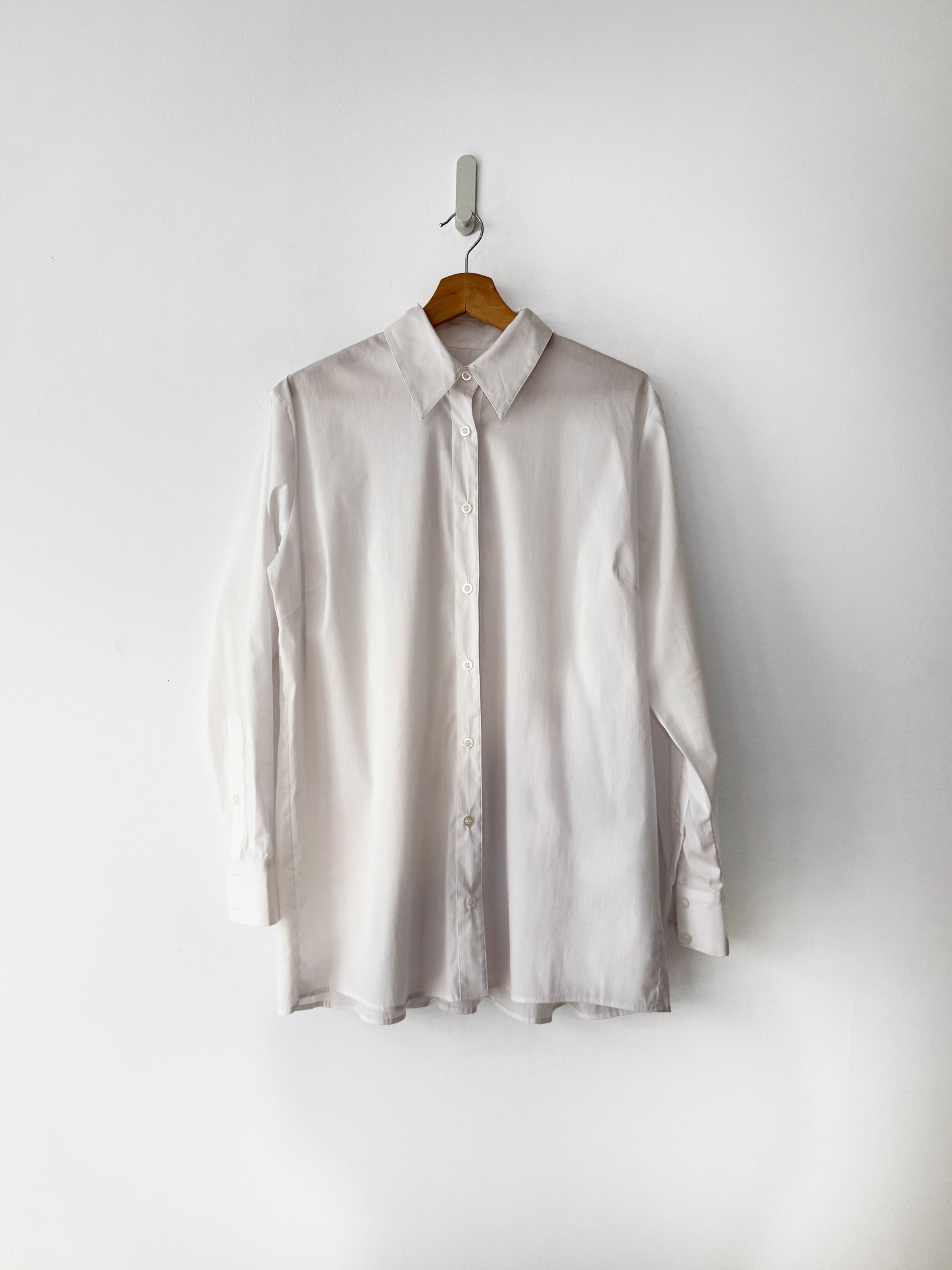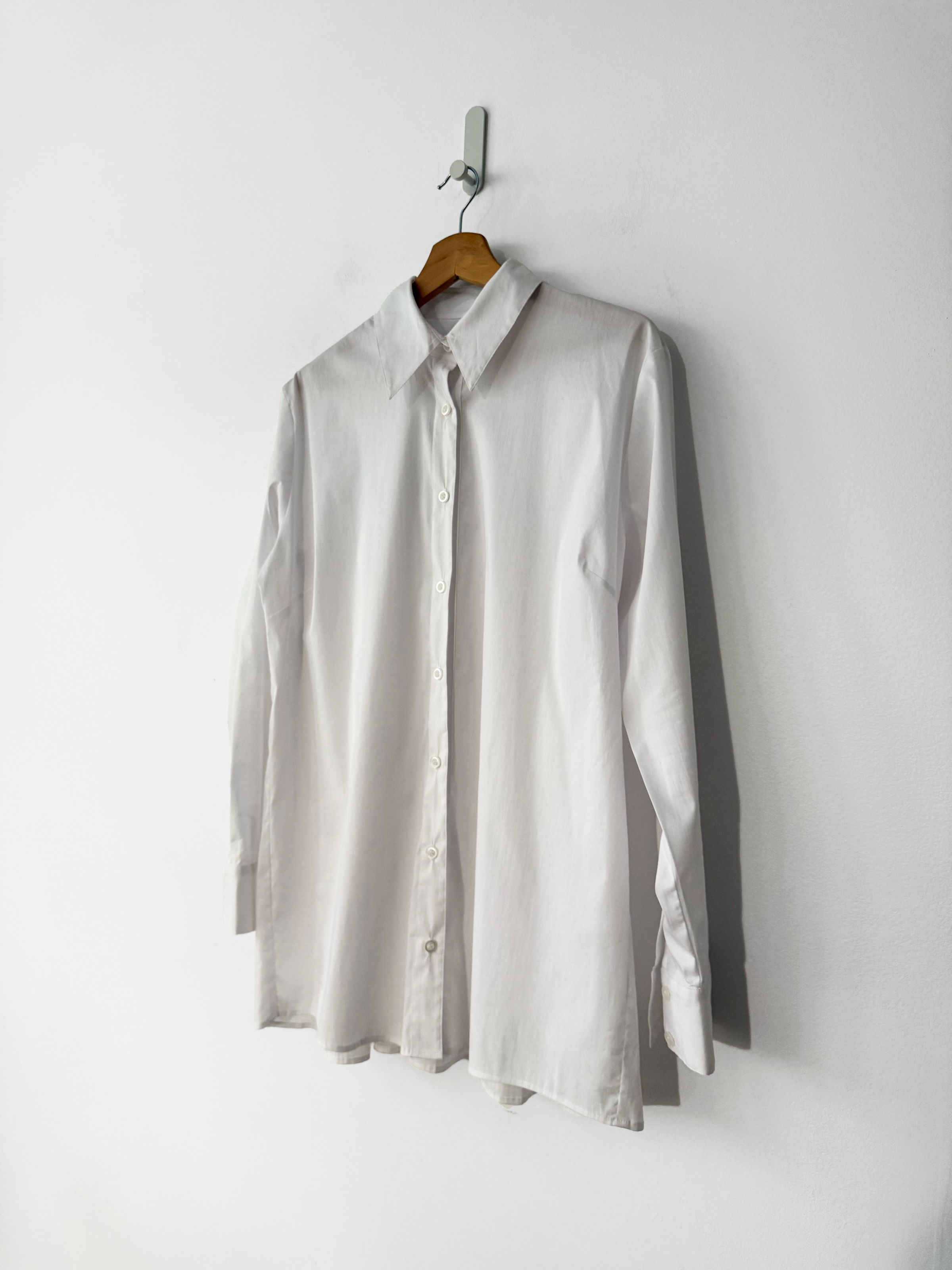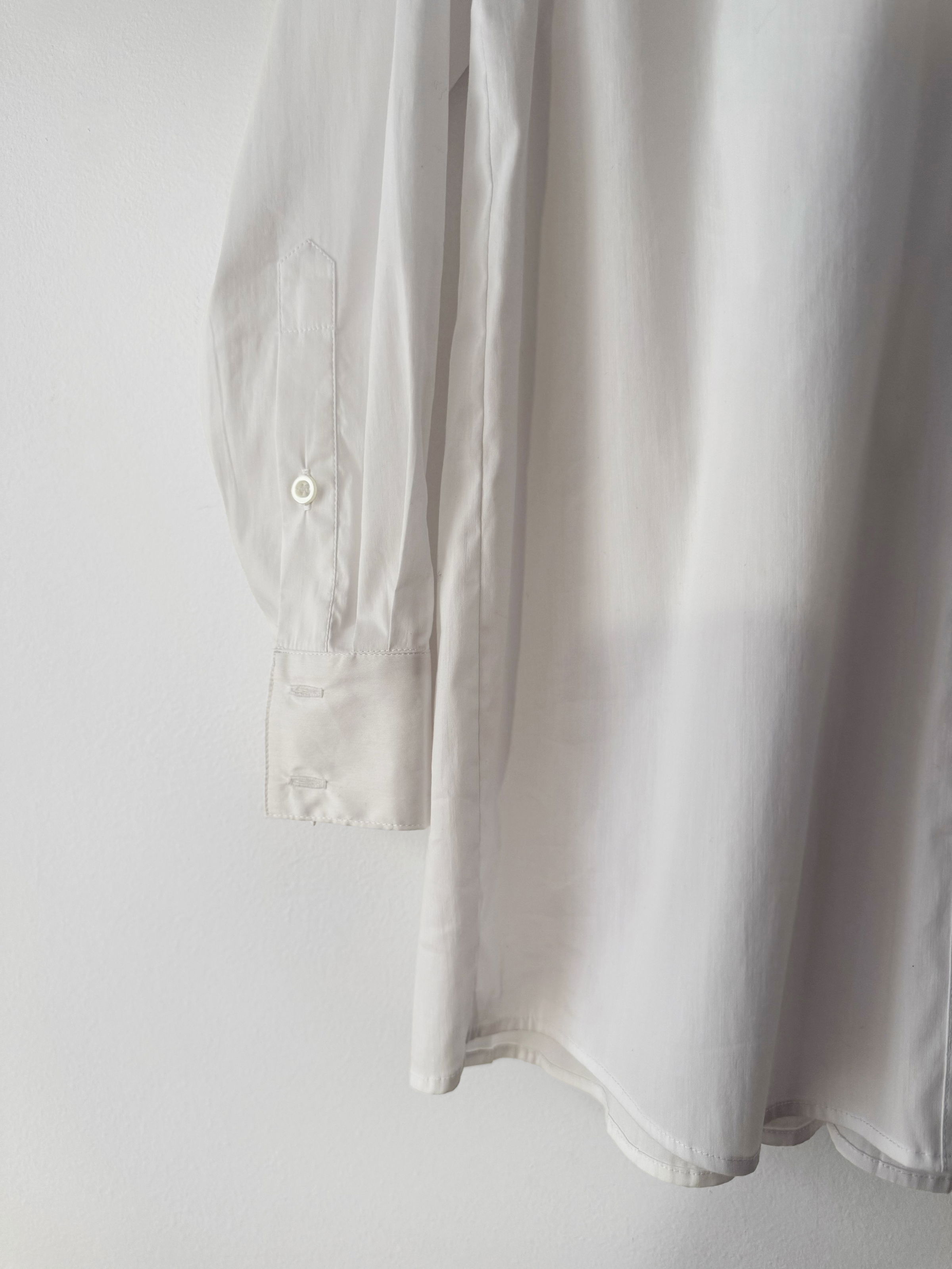 White long-sleeved, pleated-back shirt in perfect, never worn condition. Composition: 75% cotton, 20% polyamide, 5% elastane. Machine washable.