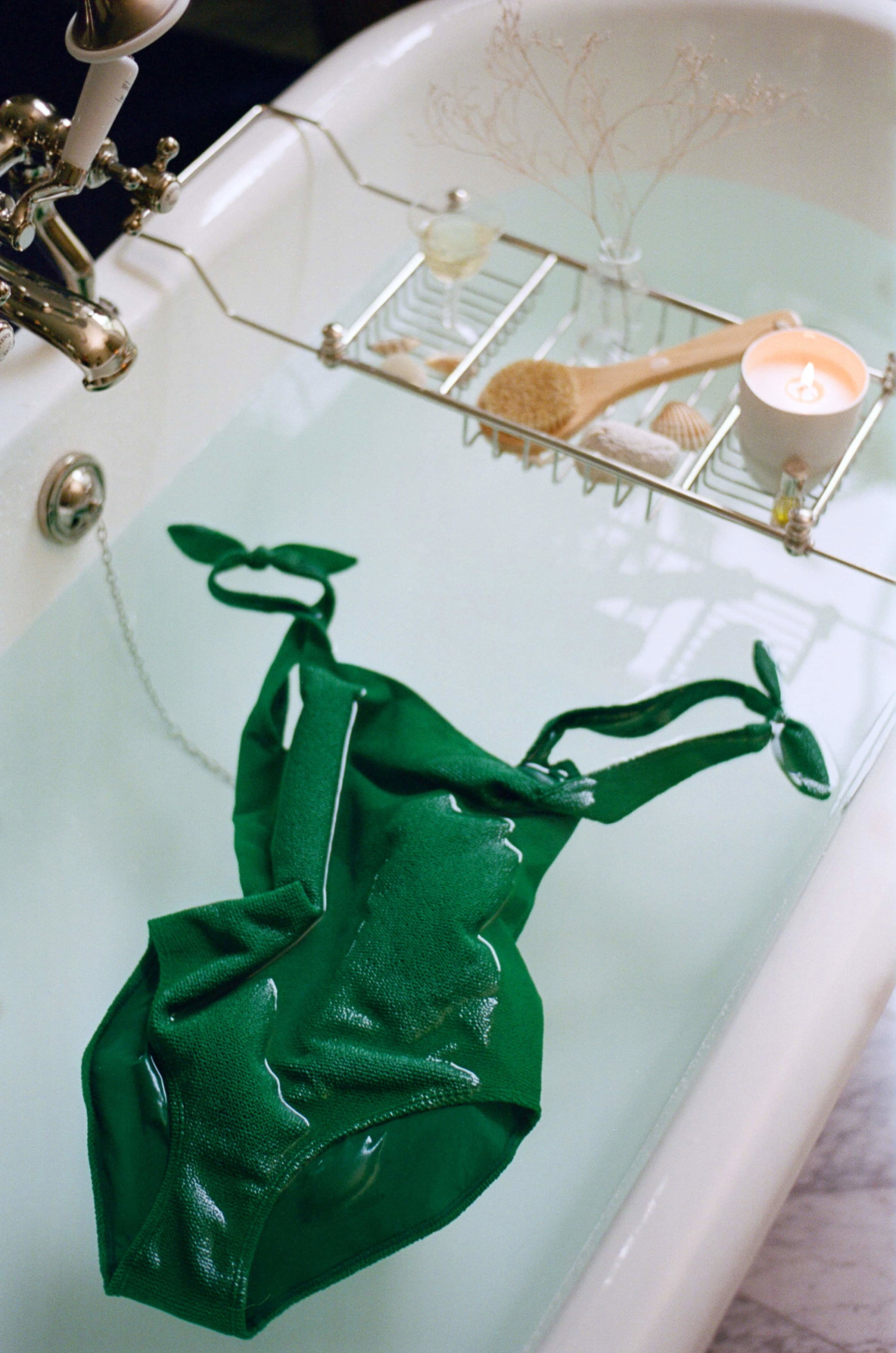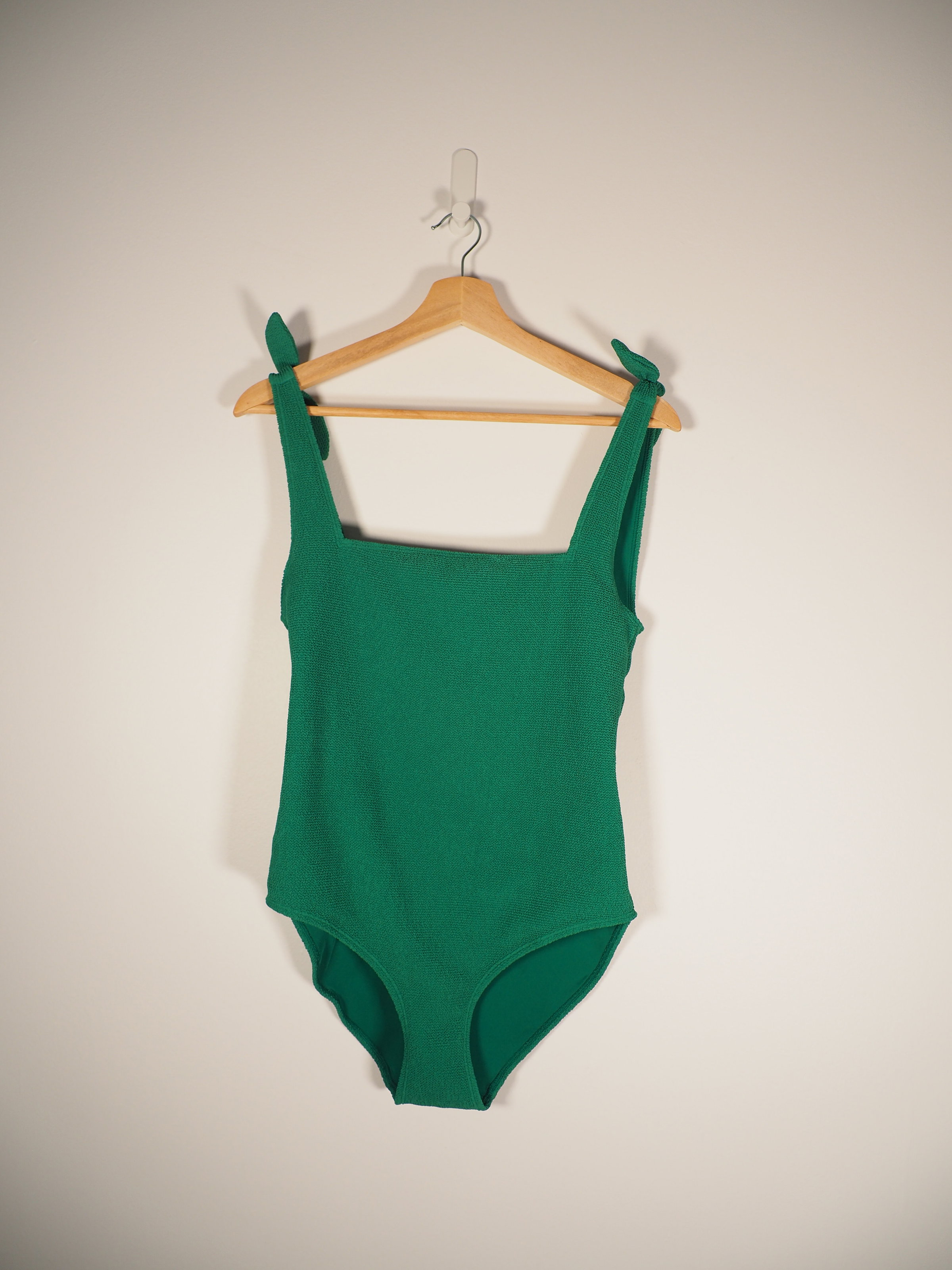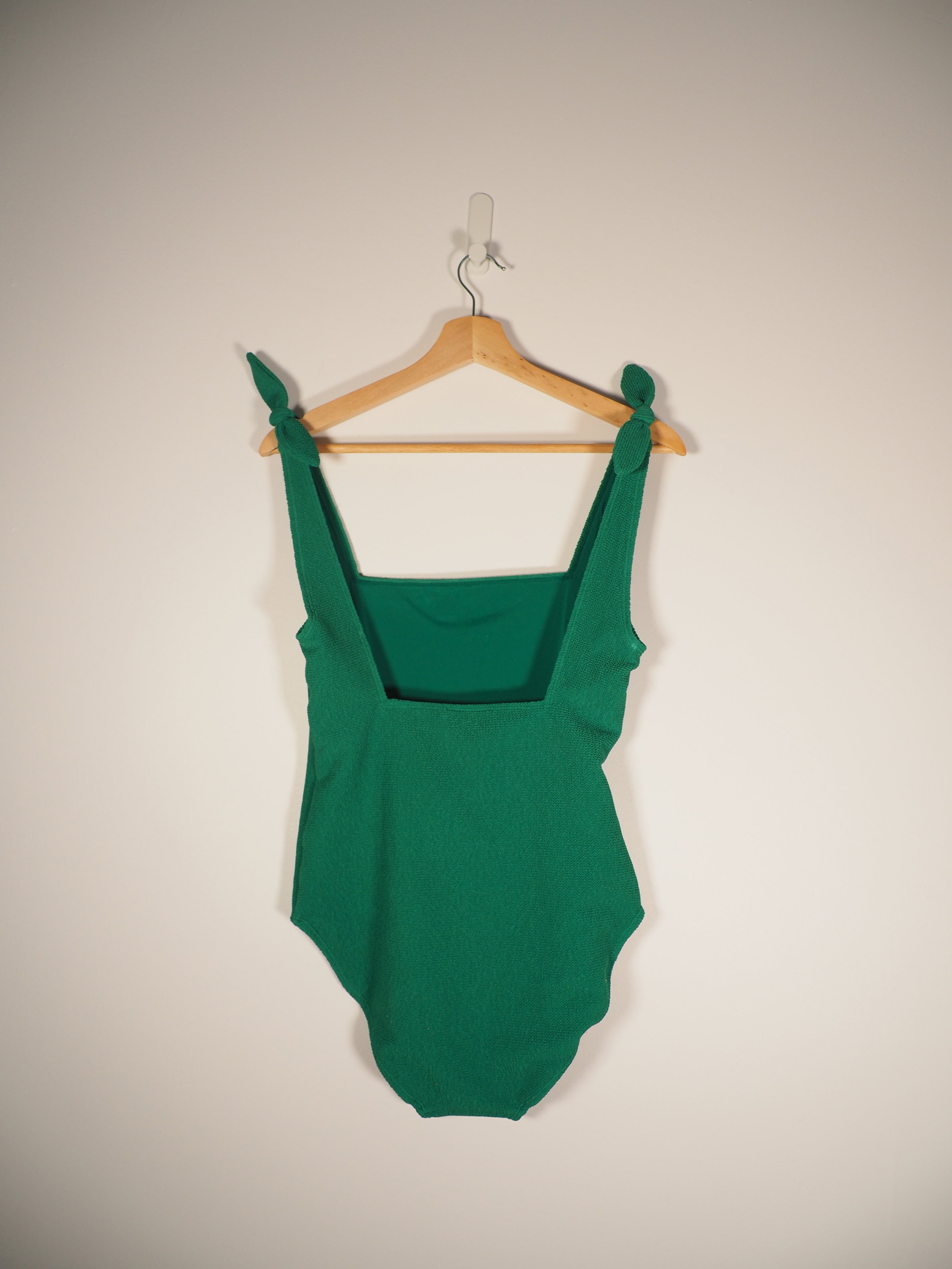Textured one-piece swimsuit featuring decorative bow ties at the shoulders and a squared neckline.