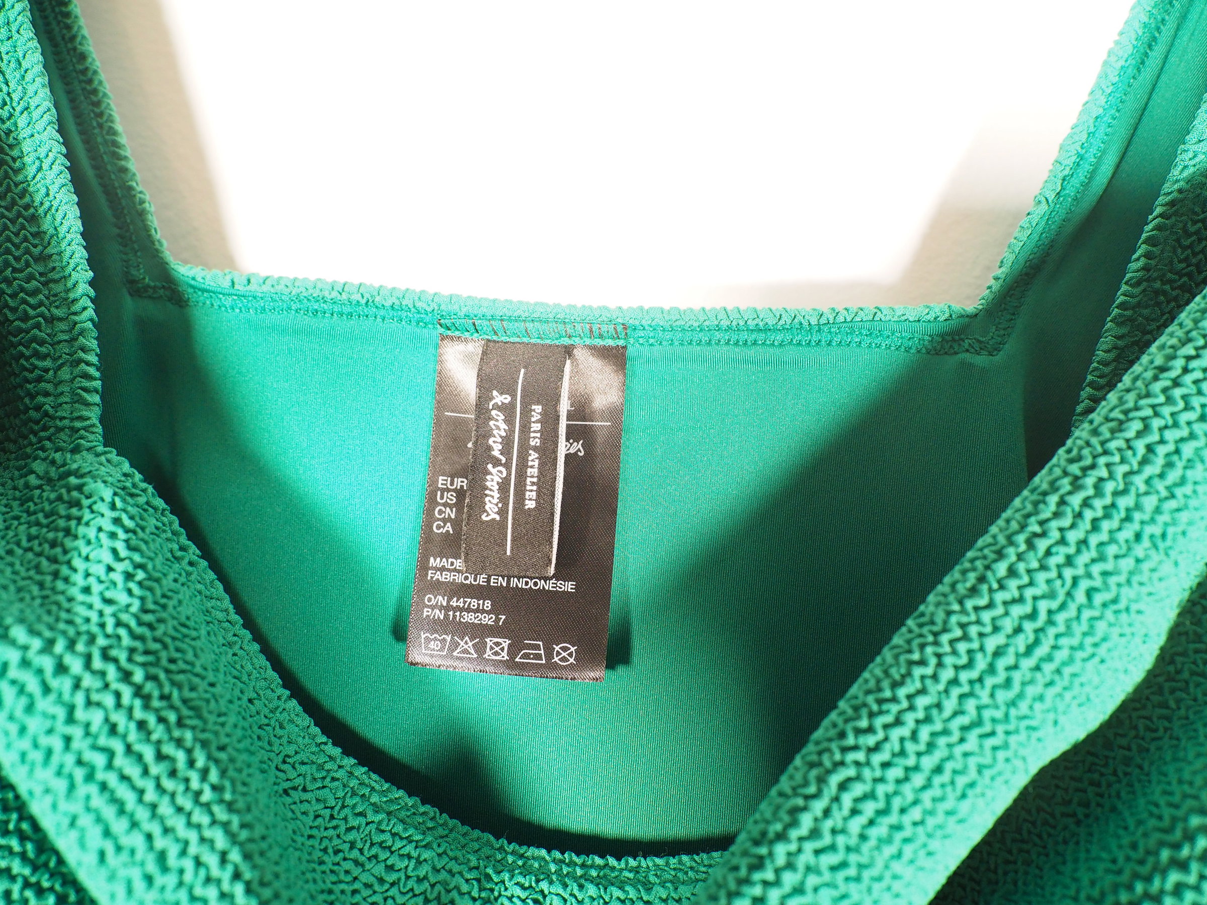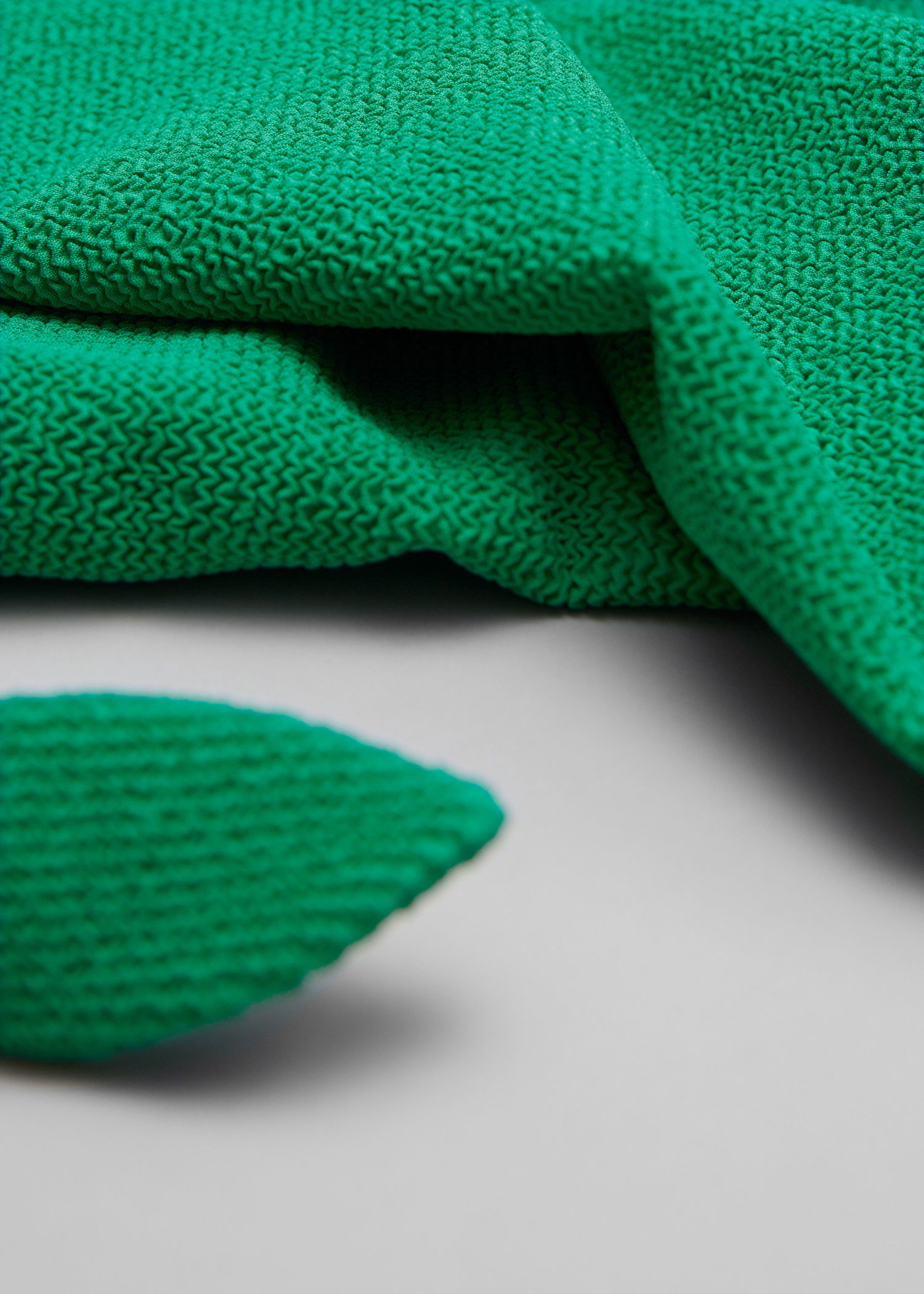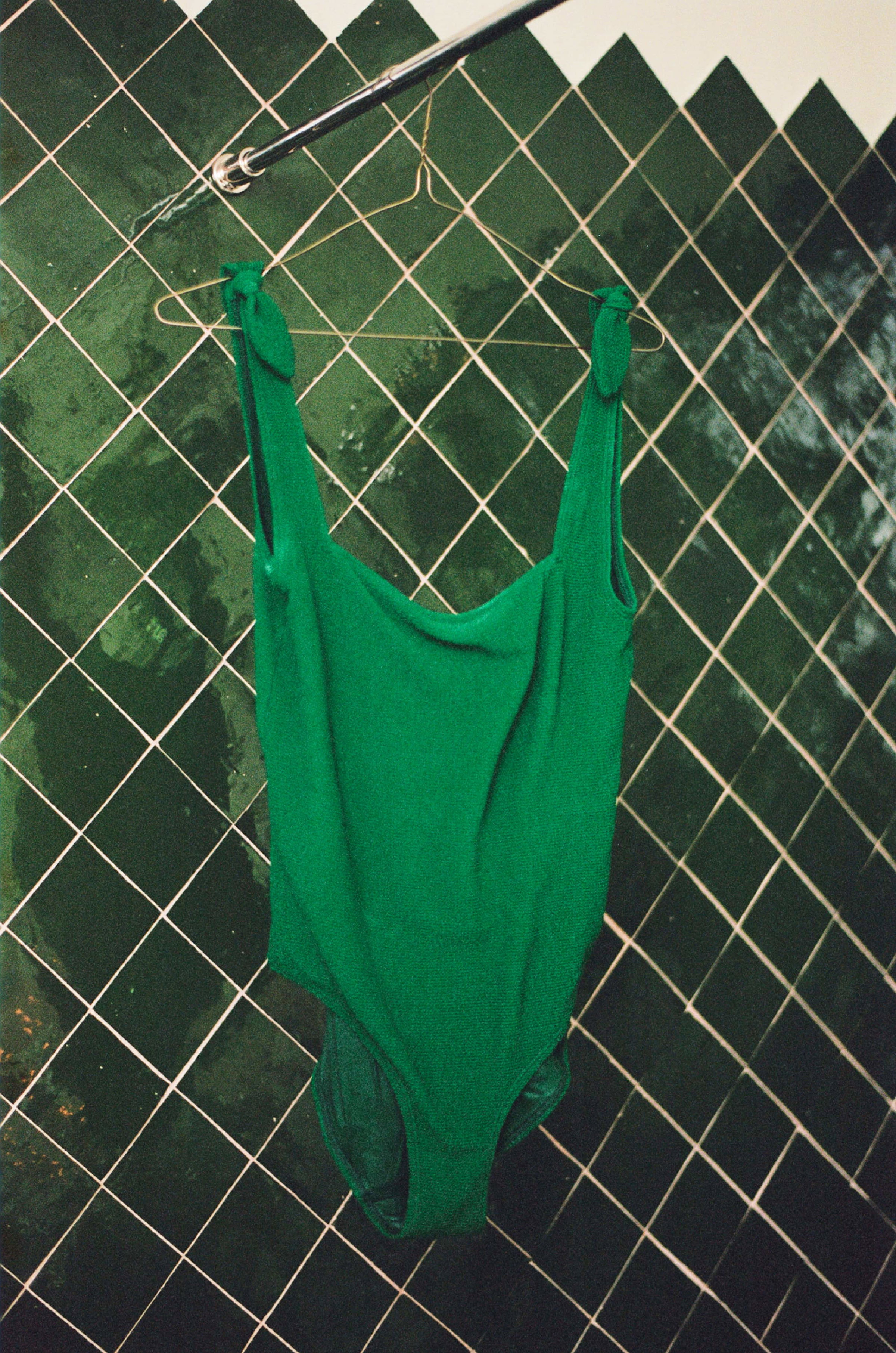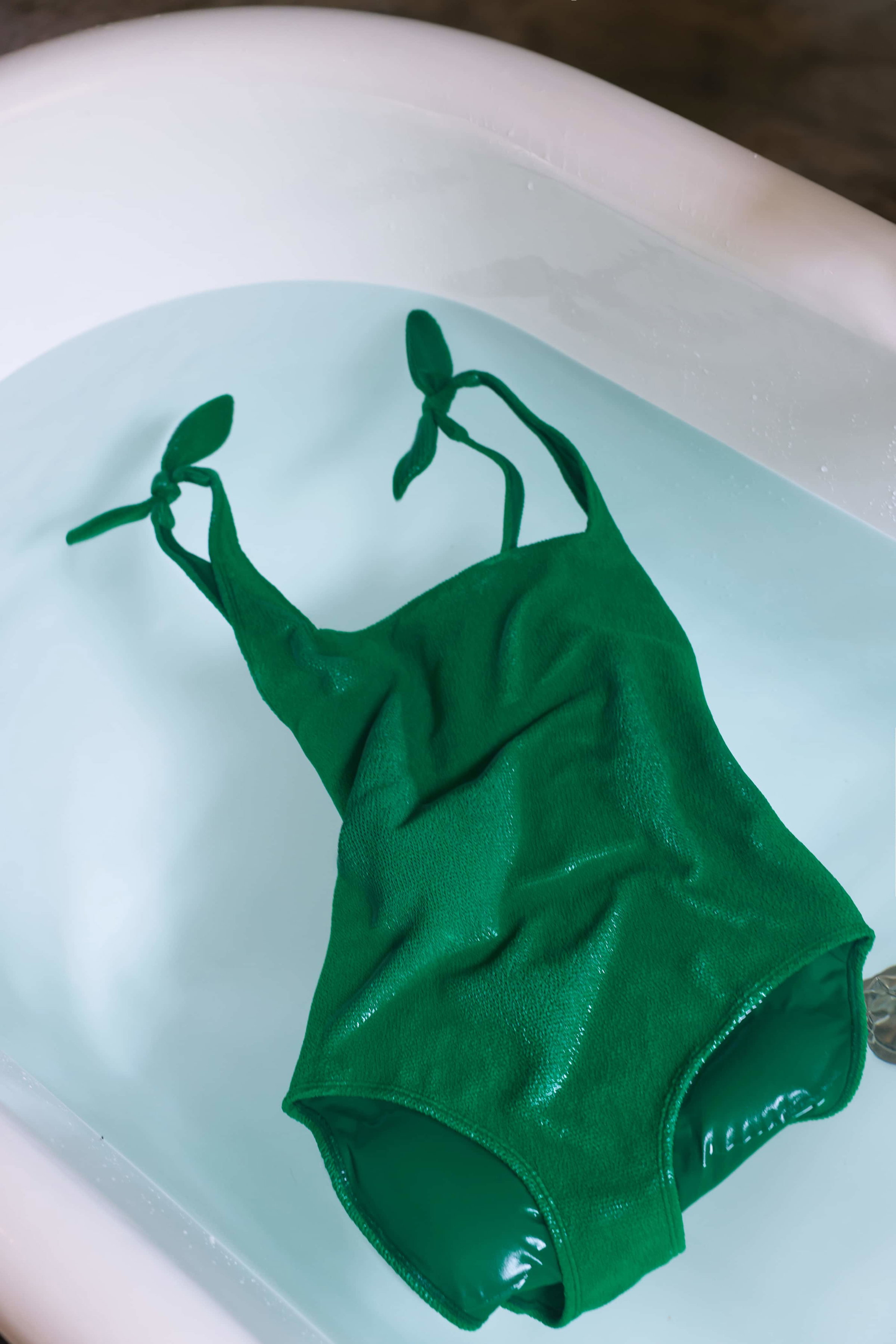 Textured one-piece swimsuit featuring decorative bow ties at the shoulders and a squared neckline.