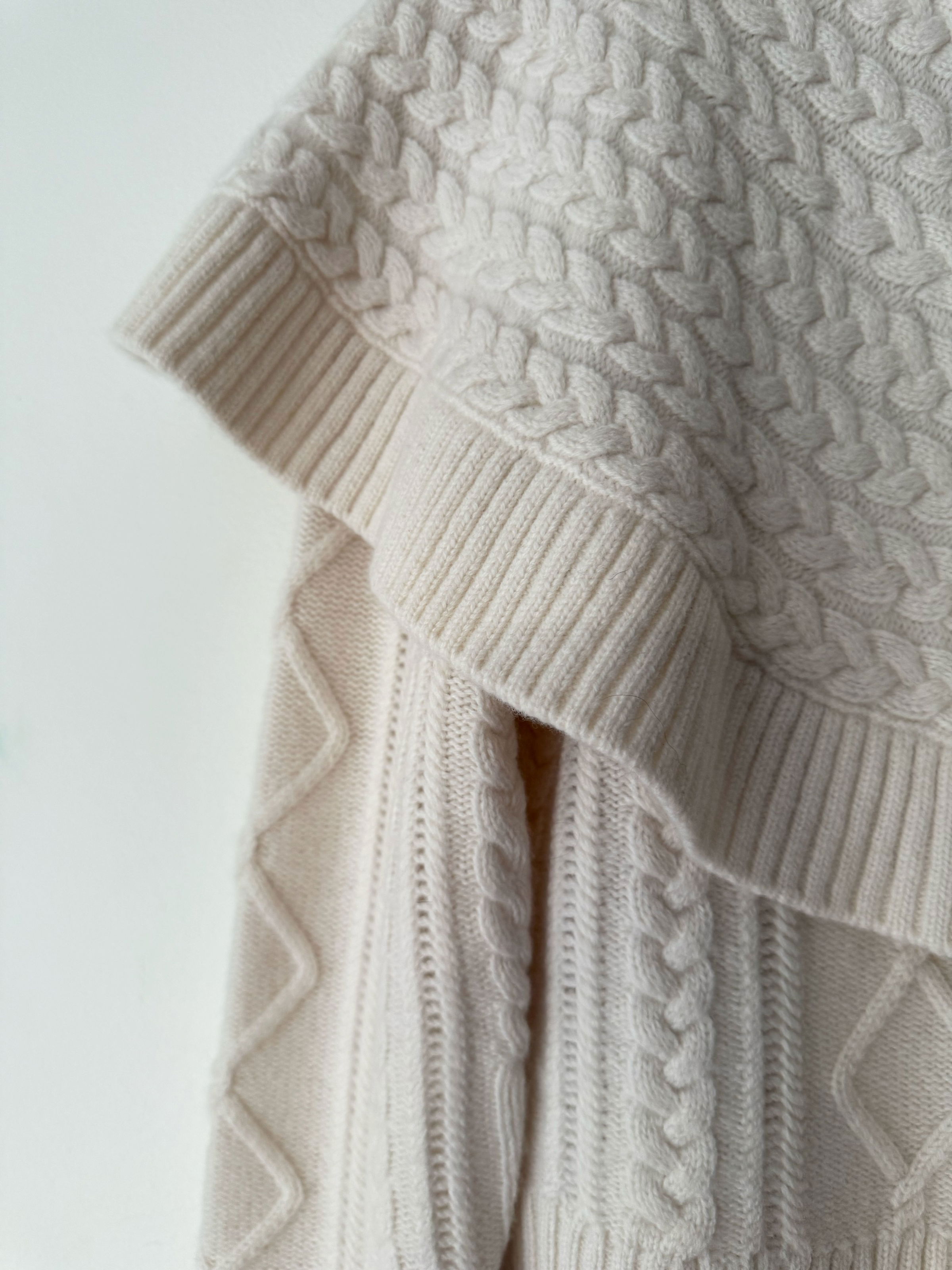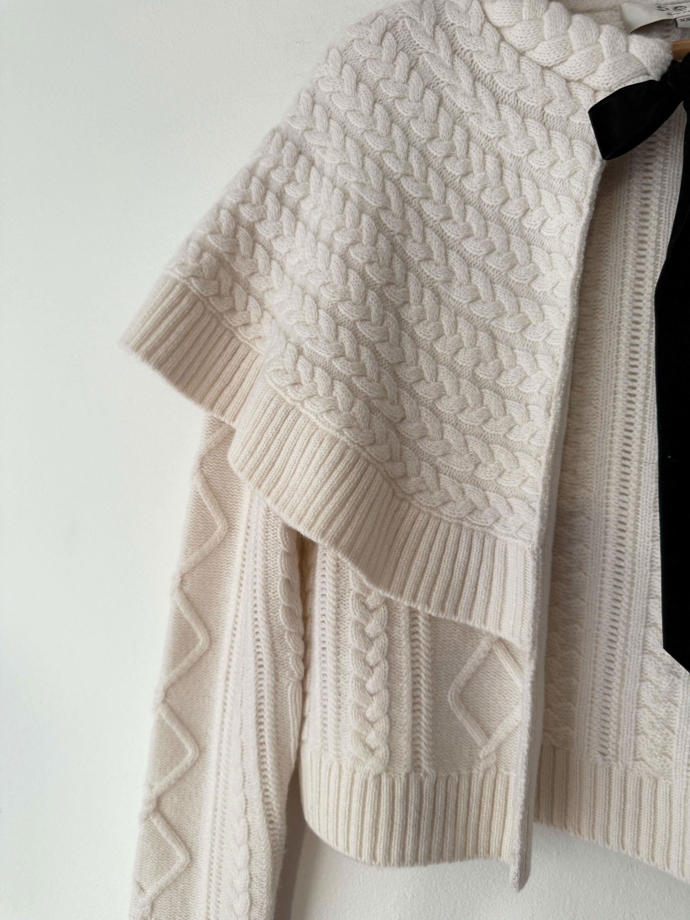 The Caleb cable knit cardigan features an oversized cape and velvet bow tie closure. 100% Merino Wool. Dry Clean only.