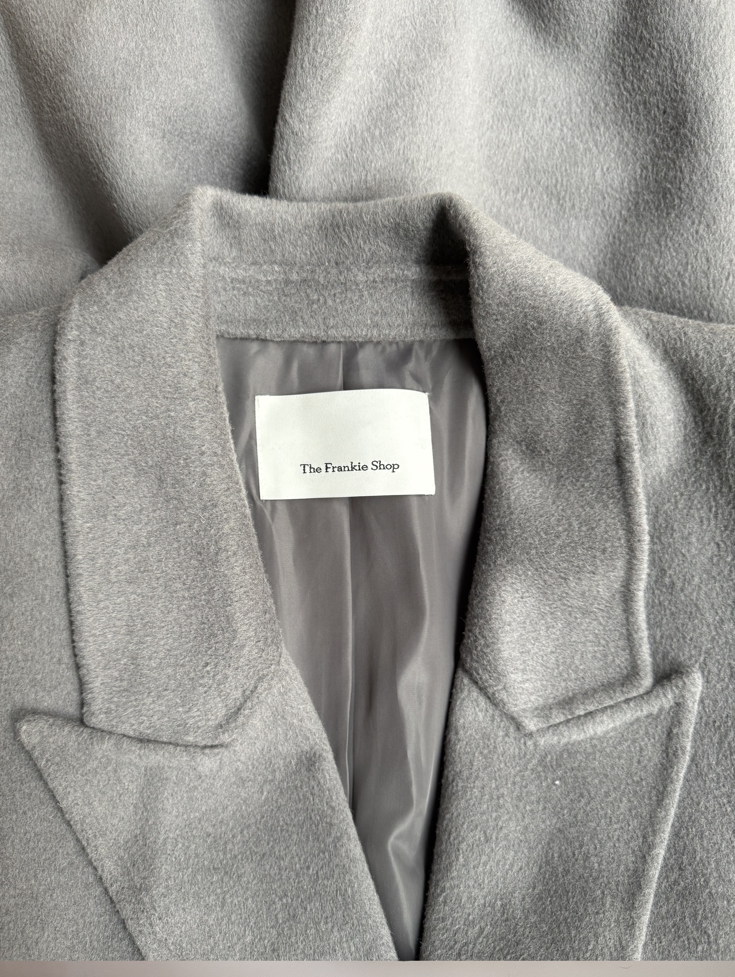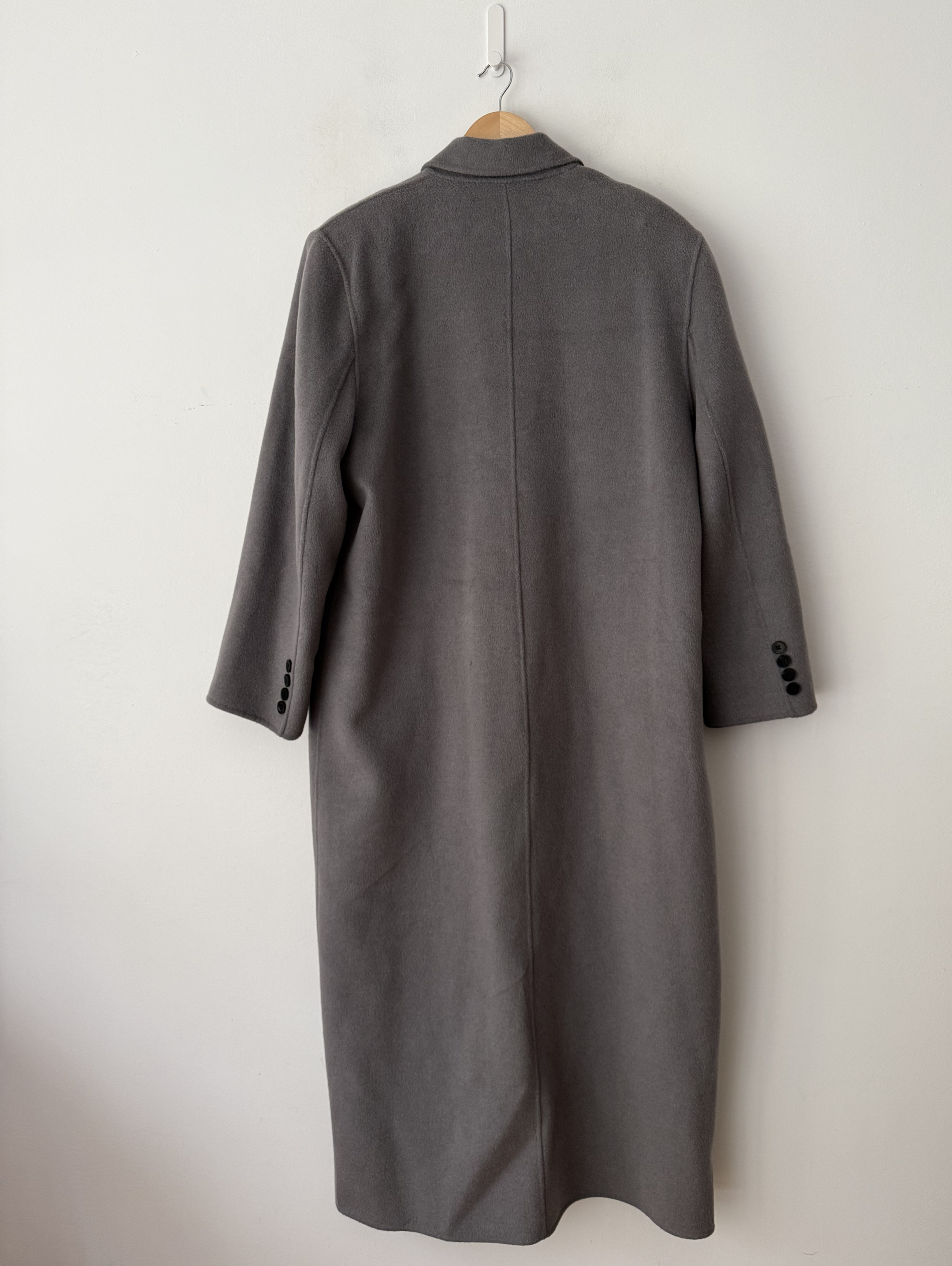 Double-breasted front button closure coat with single back vent. Mid weight wool blend fabric. Oversized silhouette. Maxi length. so advisable to size down. Peak lapels. Dropped shoulders. Welt hip pockets. 80% Wool 20% Polyamide. Dry Clean only.