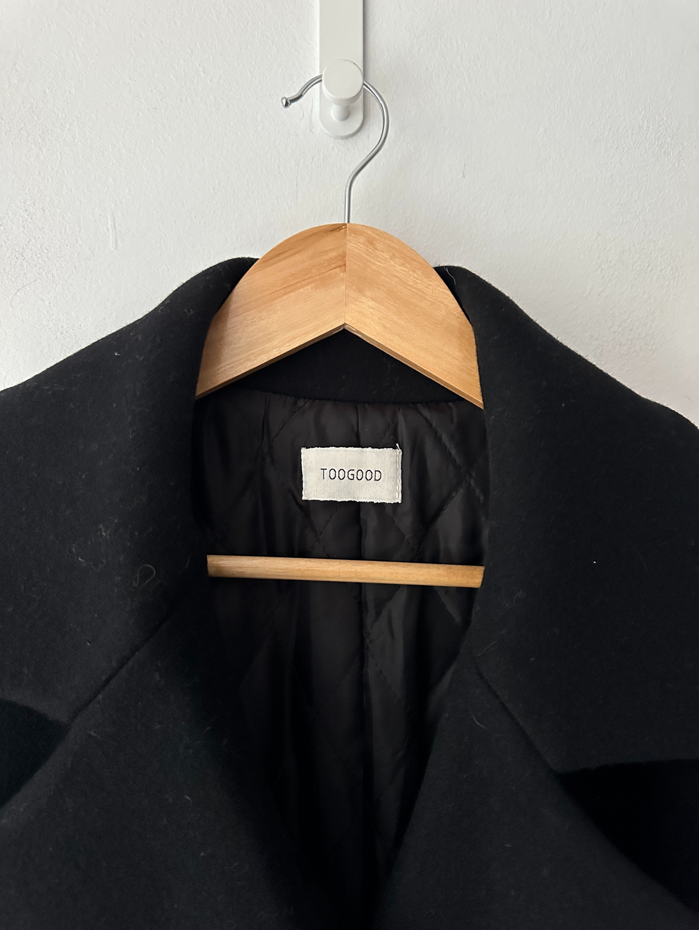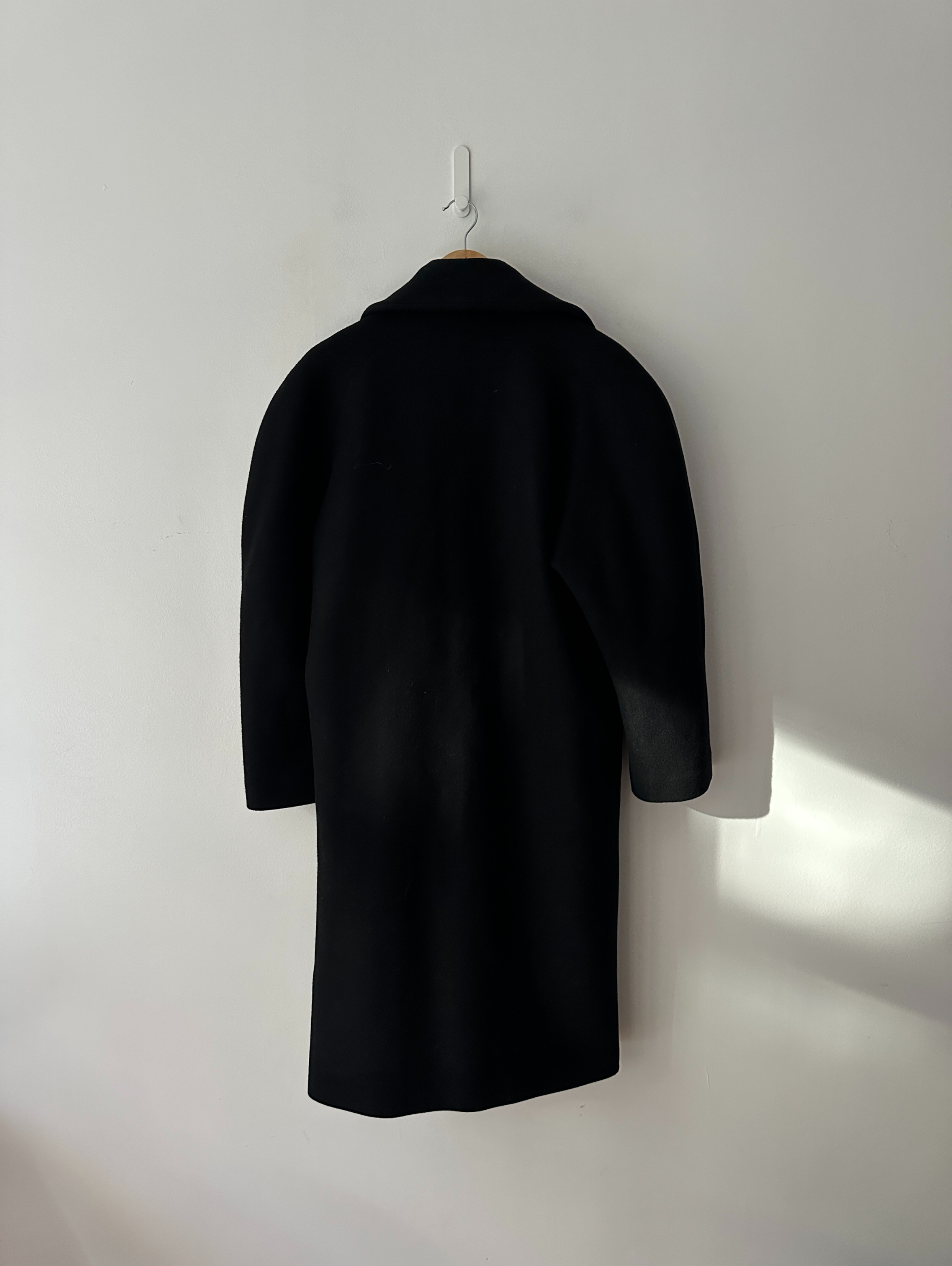 Toogood ink black double breasted long coat with large notched lapels in a mid-weight wool and cashmere herringbone. Features dropped shoulders, vertical welt pockets, and a vent at back. Lined in black cupro and cotton blend fabric. Finished with glossy horn-hued buttons throughout.