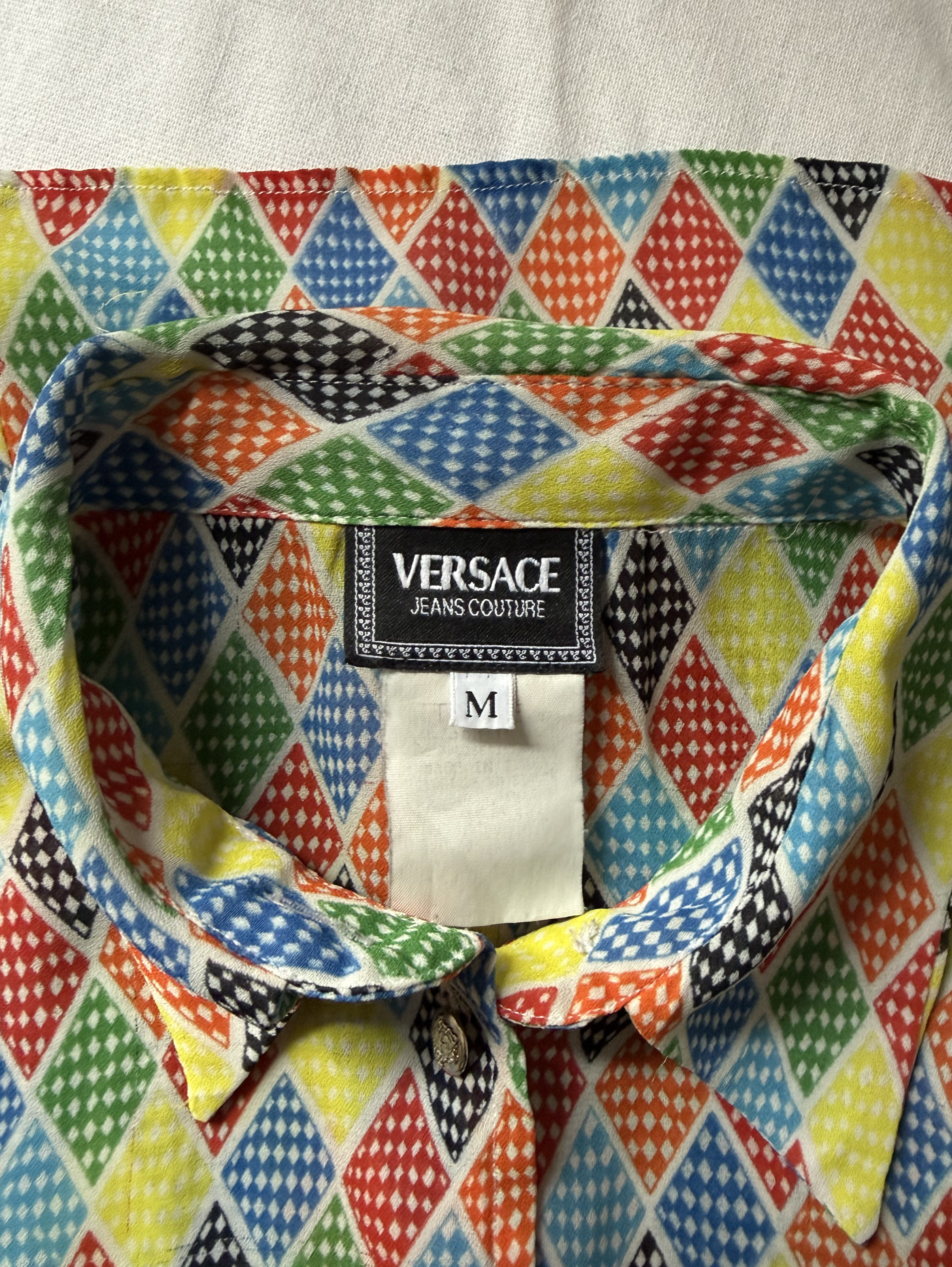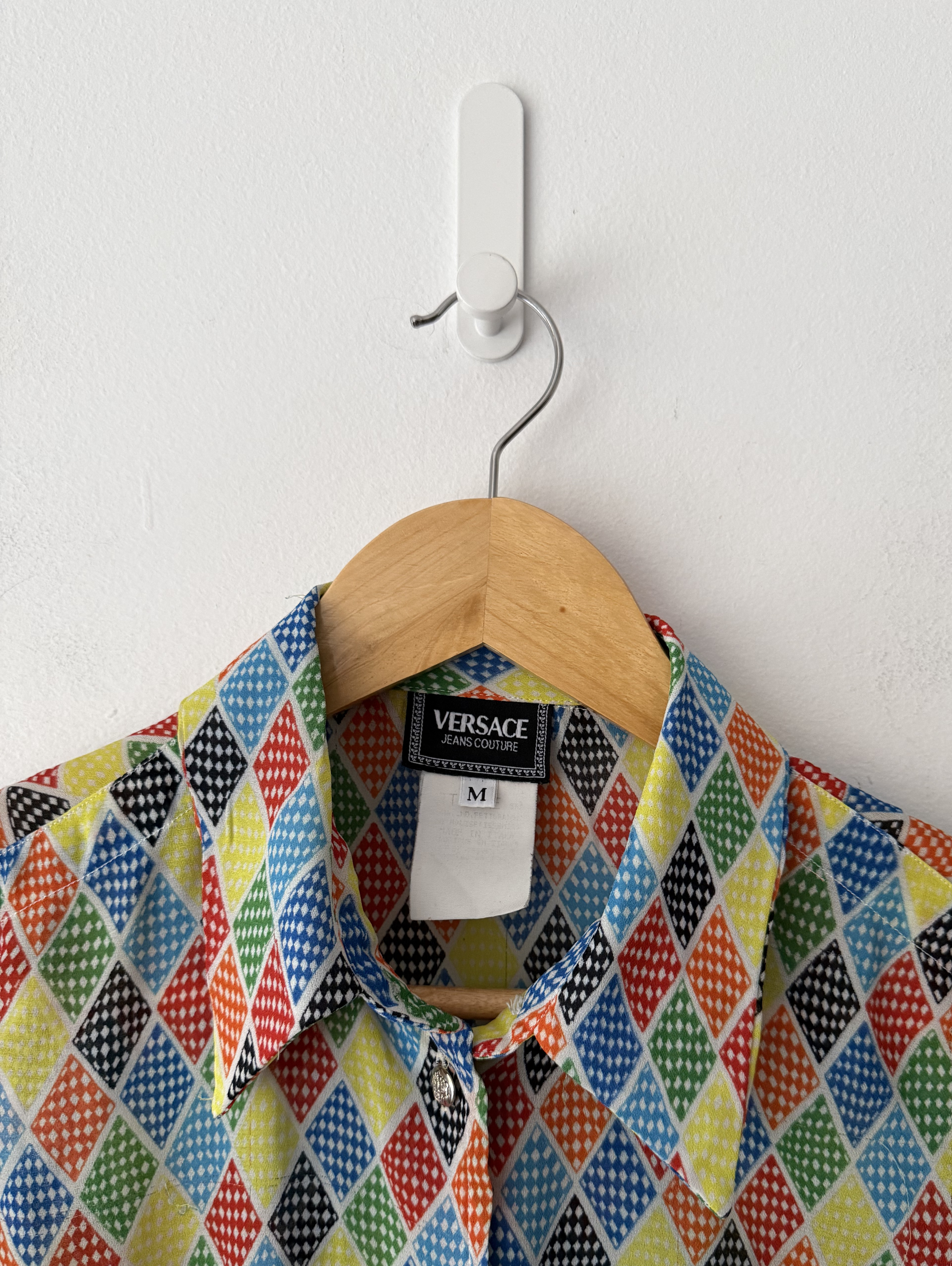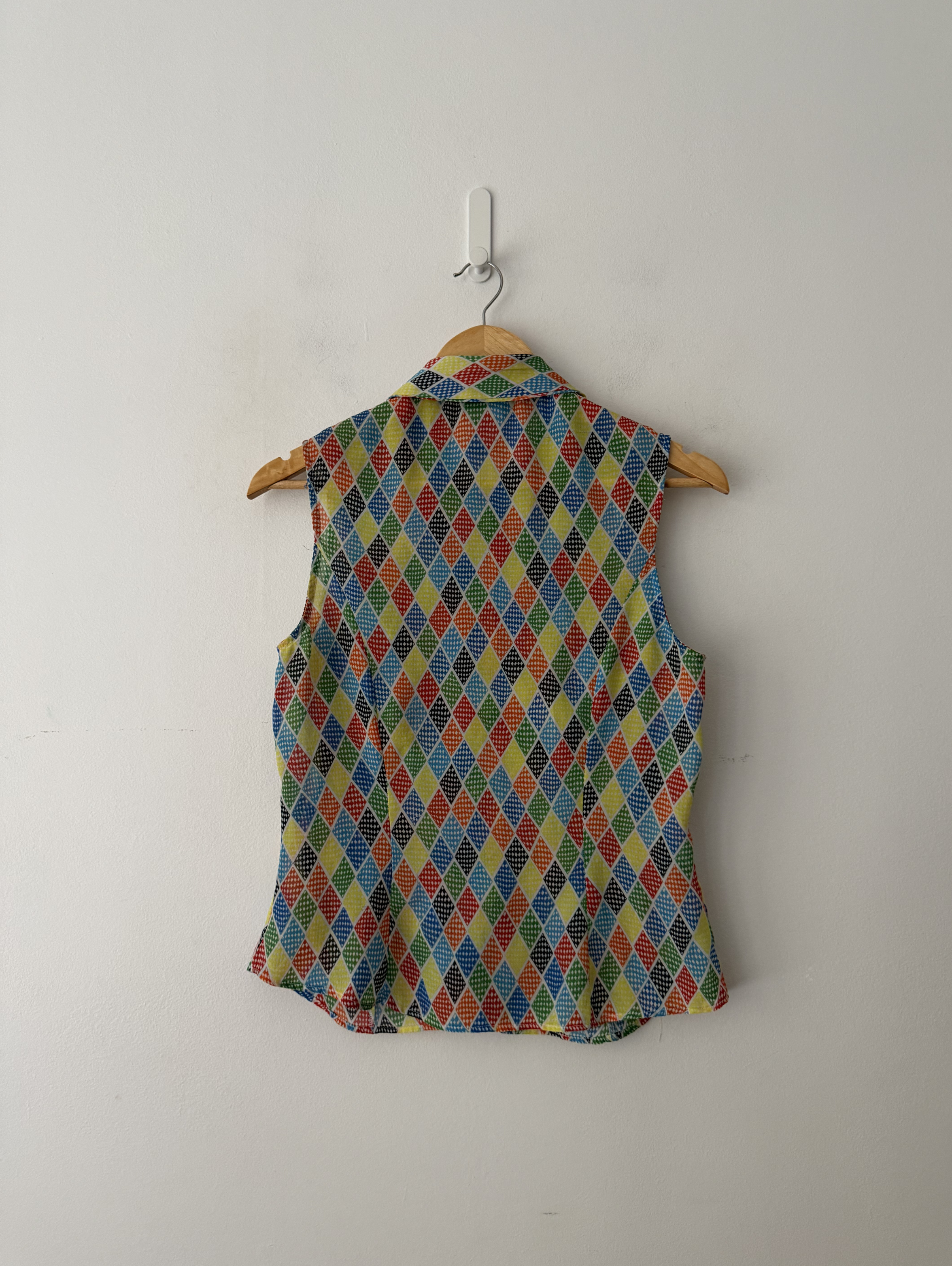 Multi coloured Harlequin Pattern Button through sleeveless shirt. One missing button at the neckline. ( price reflective of this)