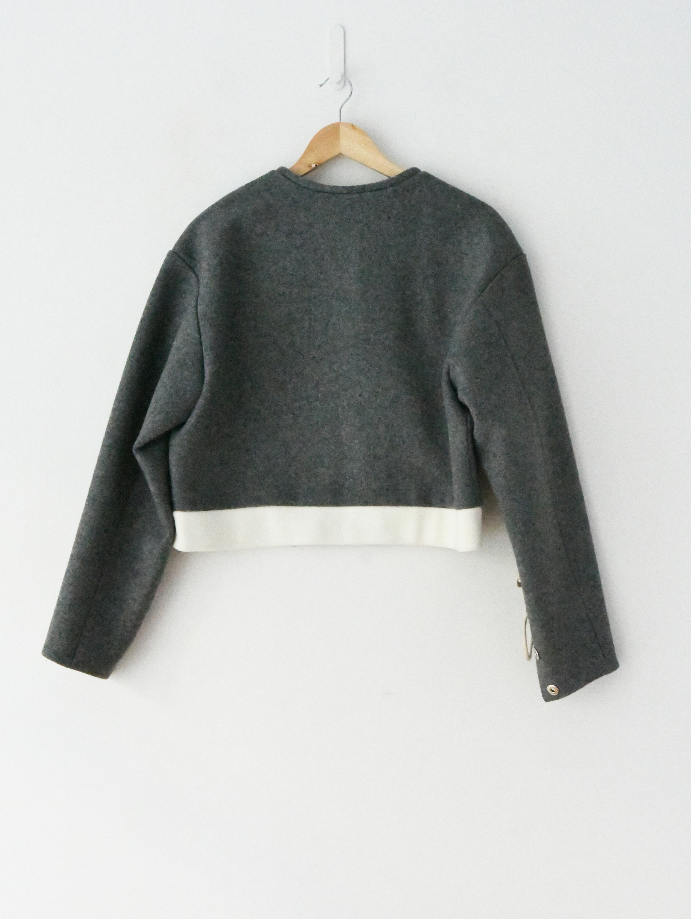 The jacket features distinctive white lace-up detailing along the sleeves and shoulders, a cropped silhouette, and a front zipper closure short-length lace-up bomber jacket.