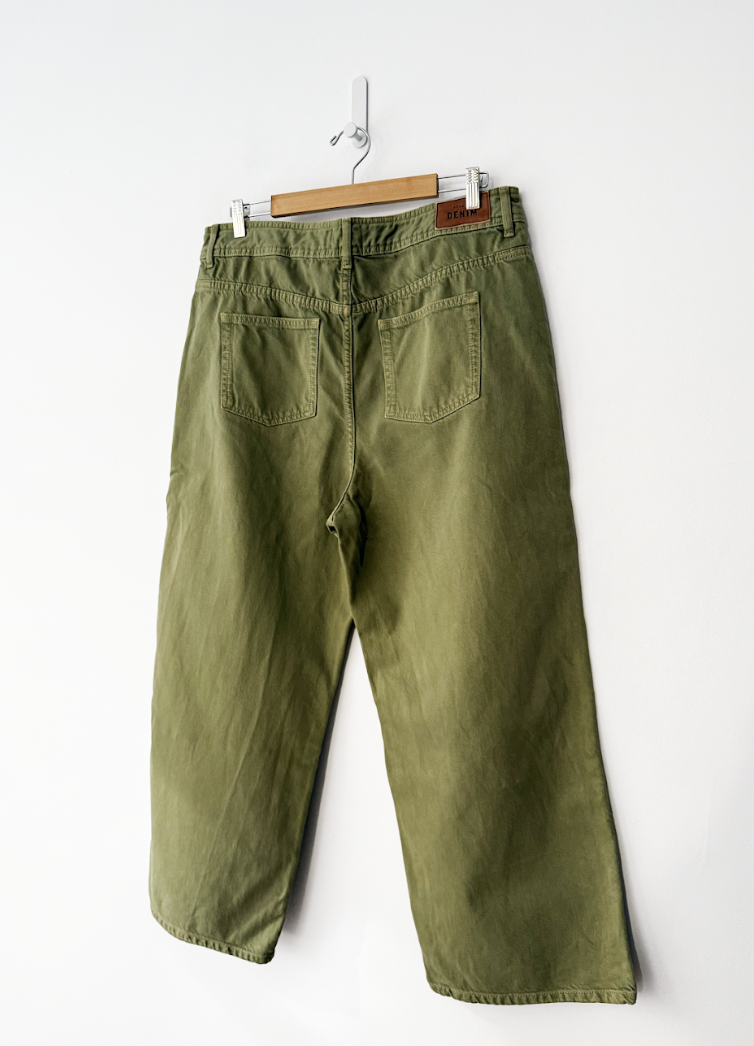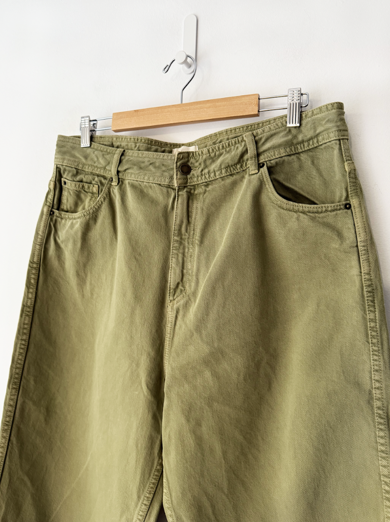 Khaki wide leg five-pocket jeans fastened with a zip fly and button. 100% cotton. Machine washable.