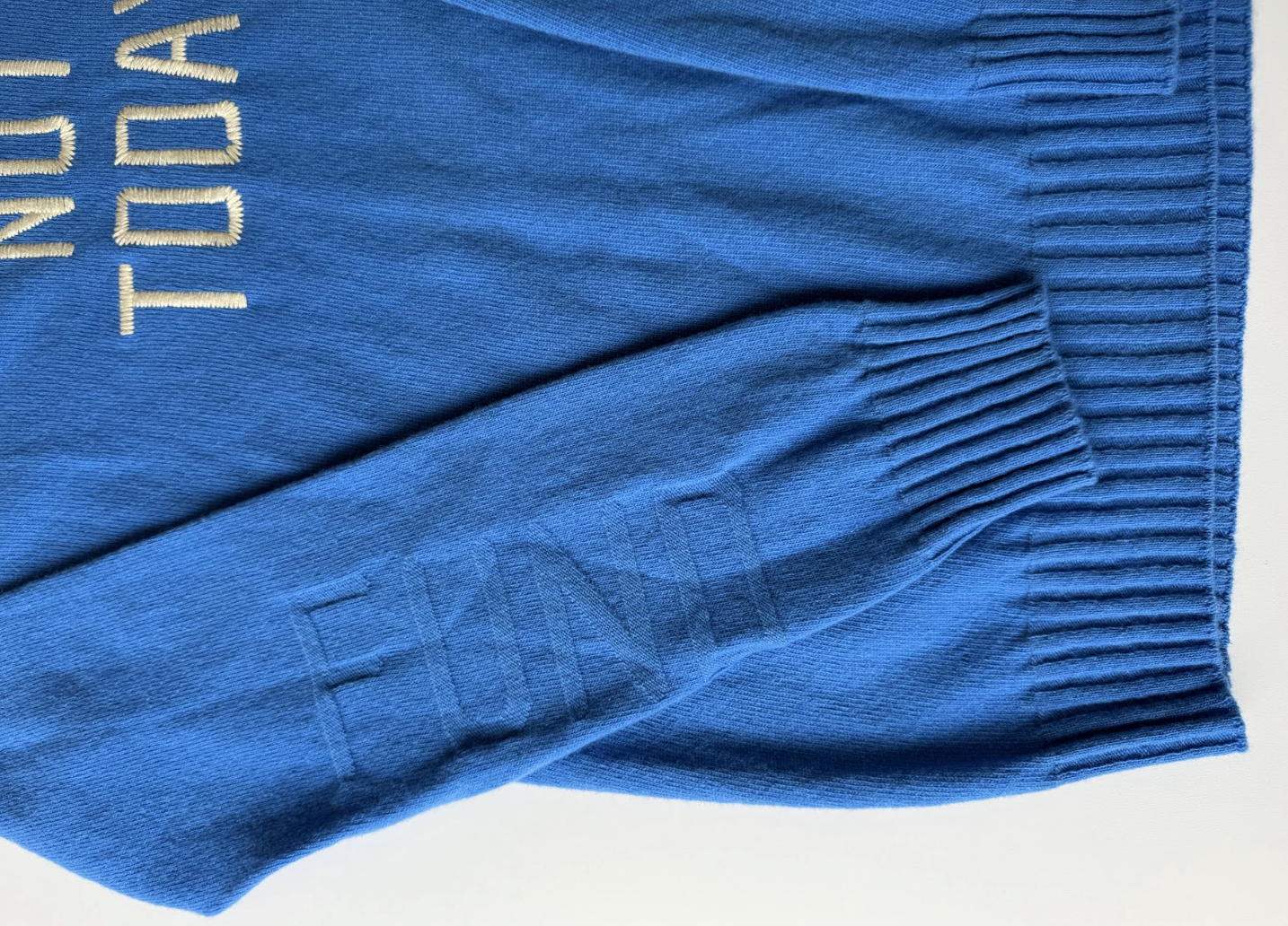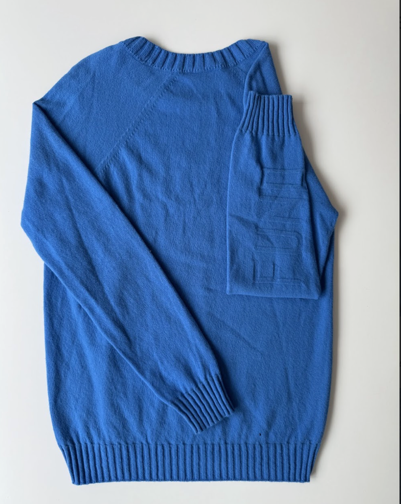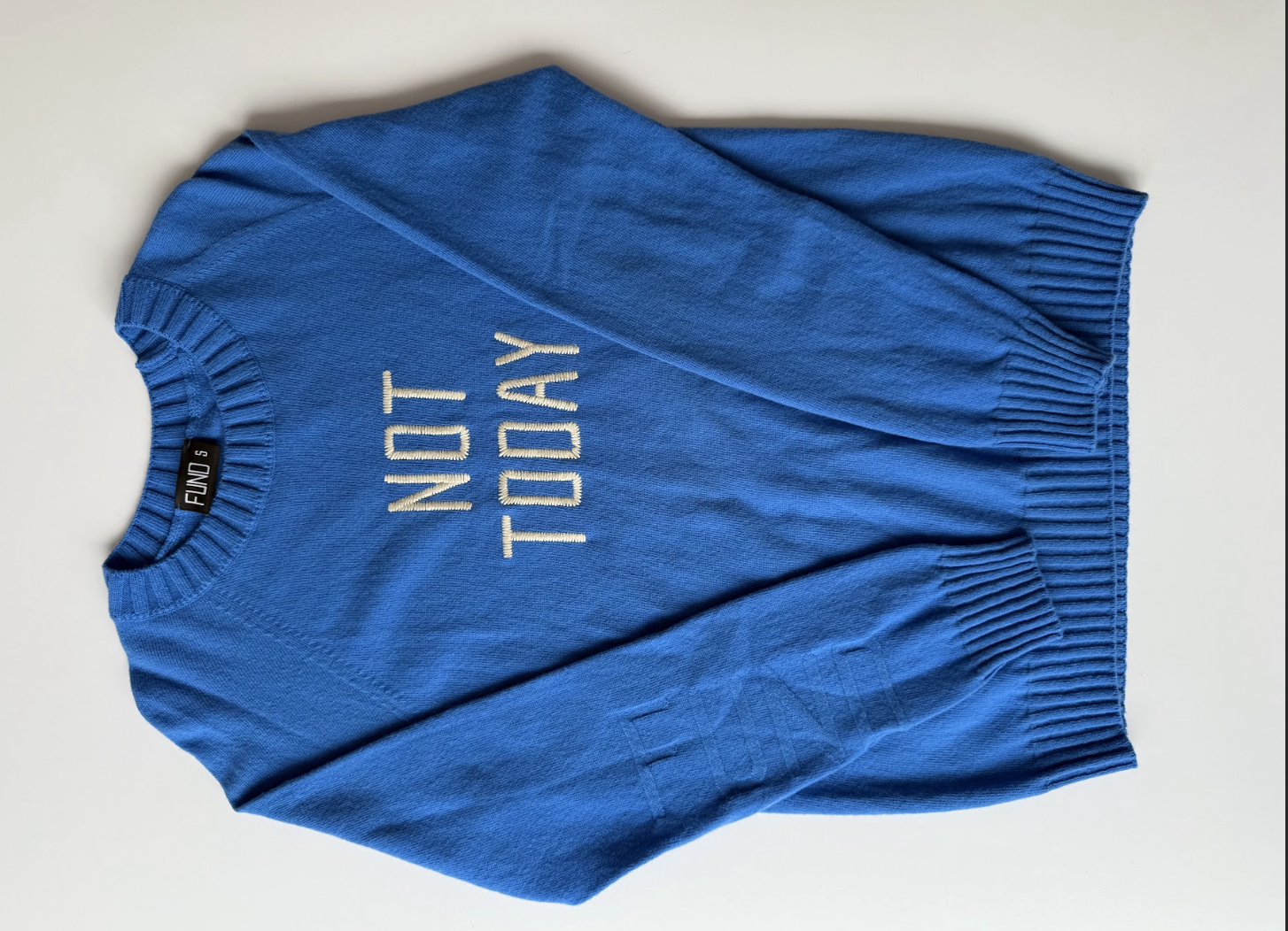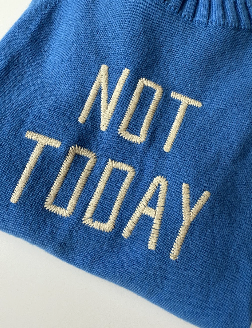 Not Today blue wool jumper, weaved, embroidered and hand-finished in england using the finest luxury yarns. 100% Wool. Dry Clean only. Small hole towards the seam on the back.