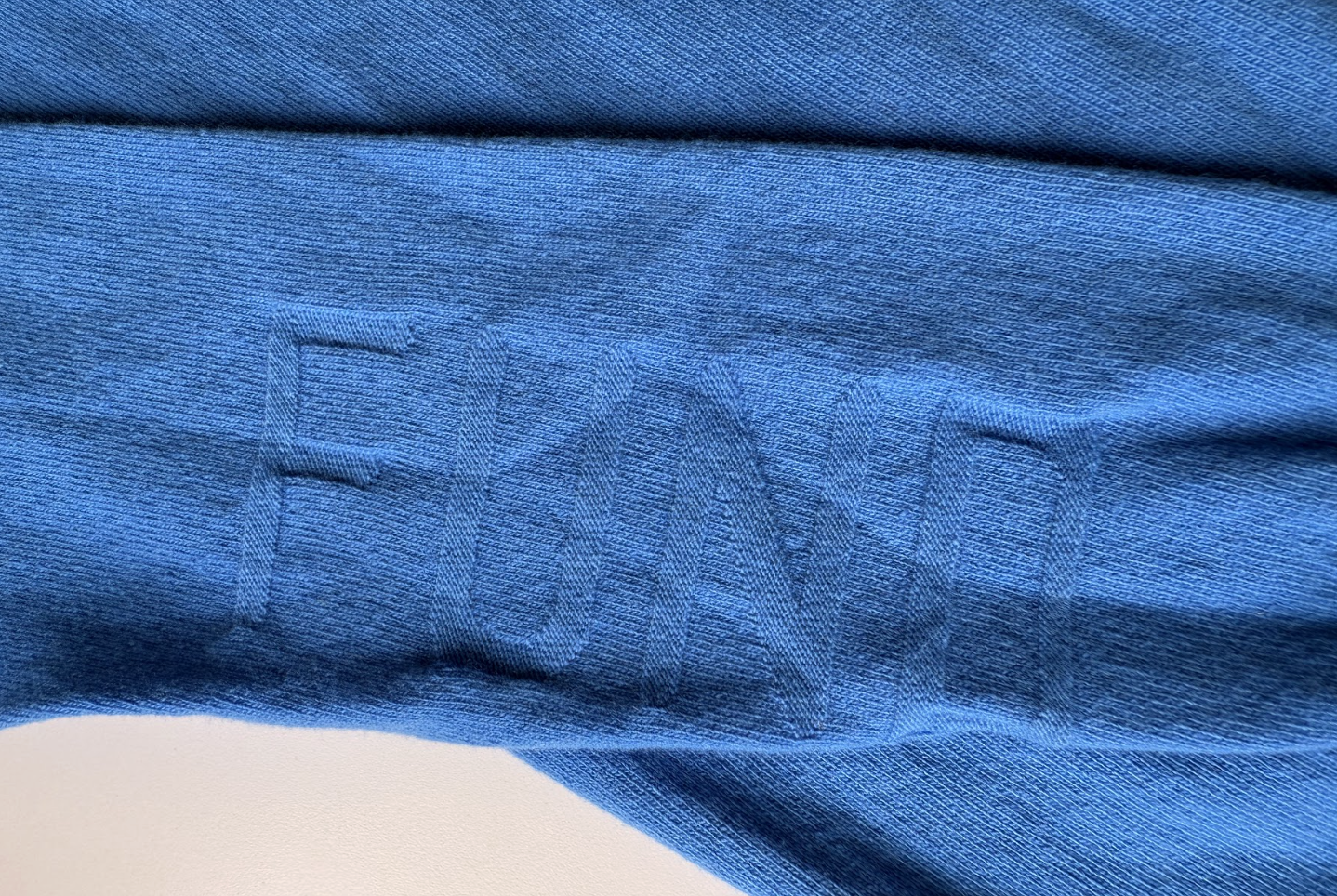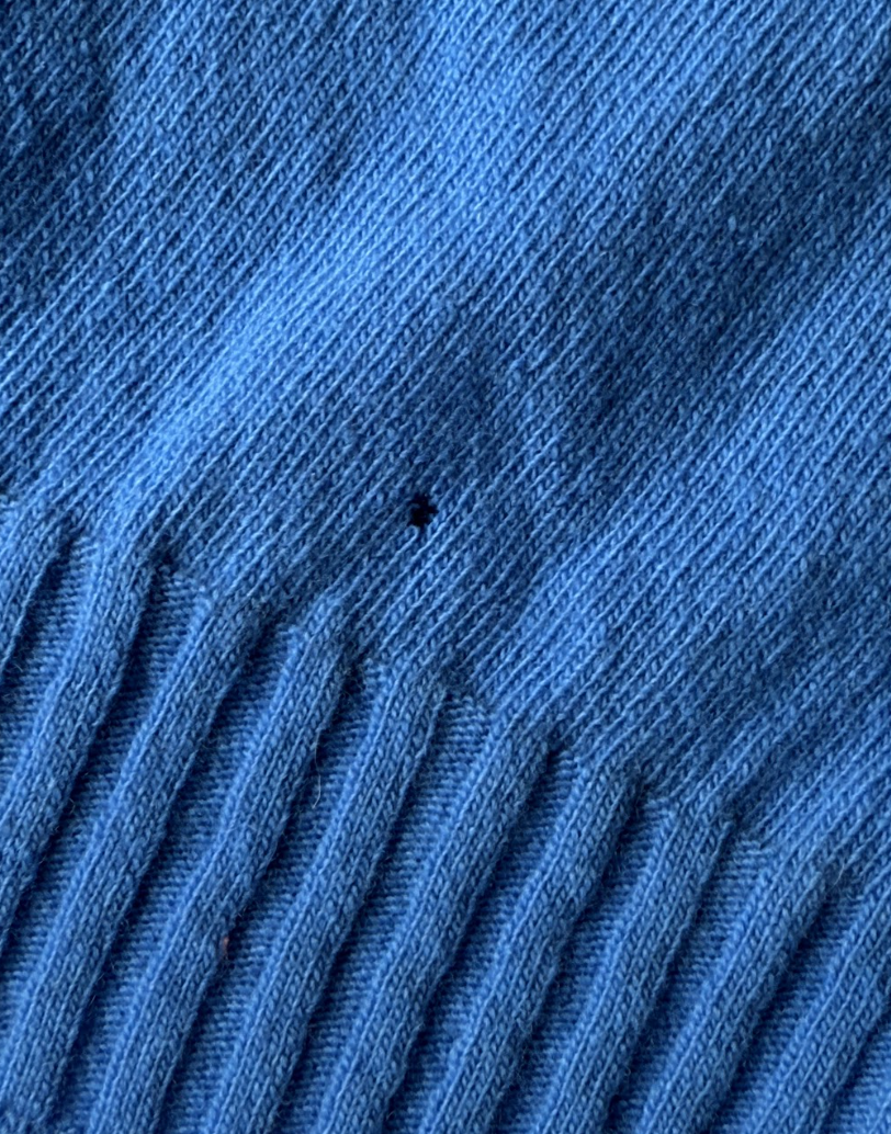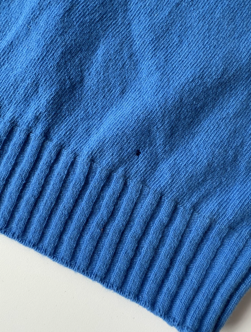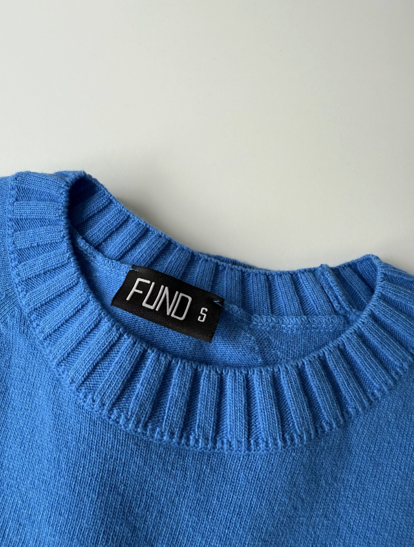 Not Today blue wool jumper, weaved, embroidered and hand-finished in england using the finest luxury yarns. 100% Wool. Dry Clean only. Small hole towards the seam on the back.