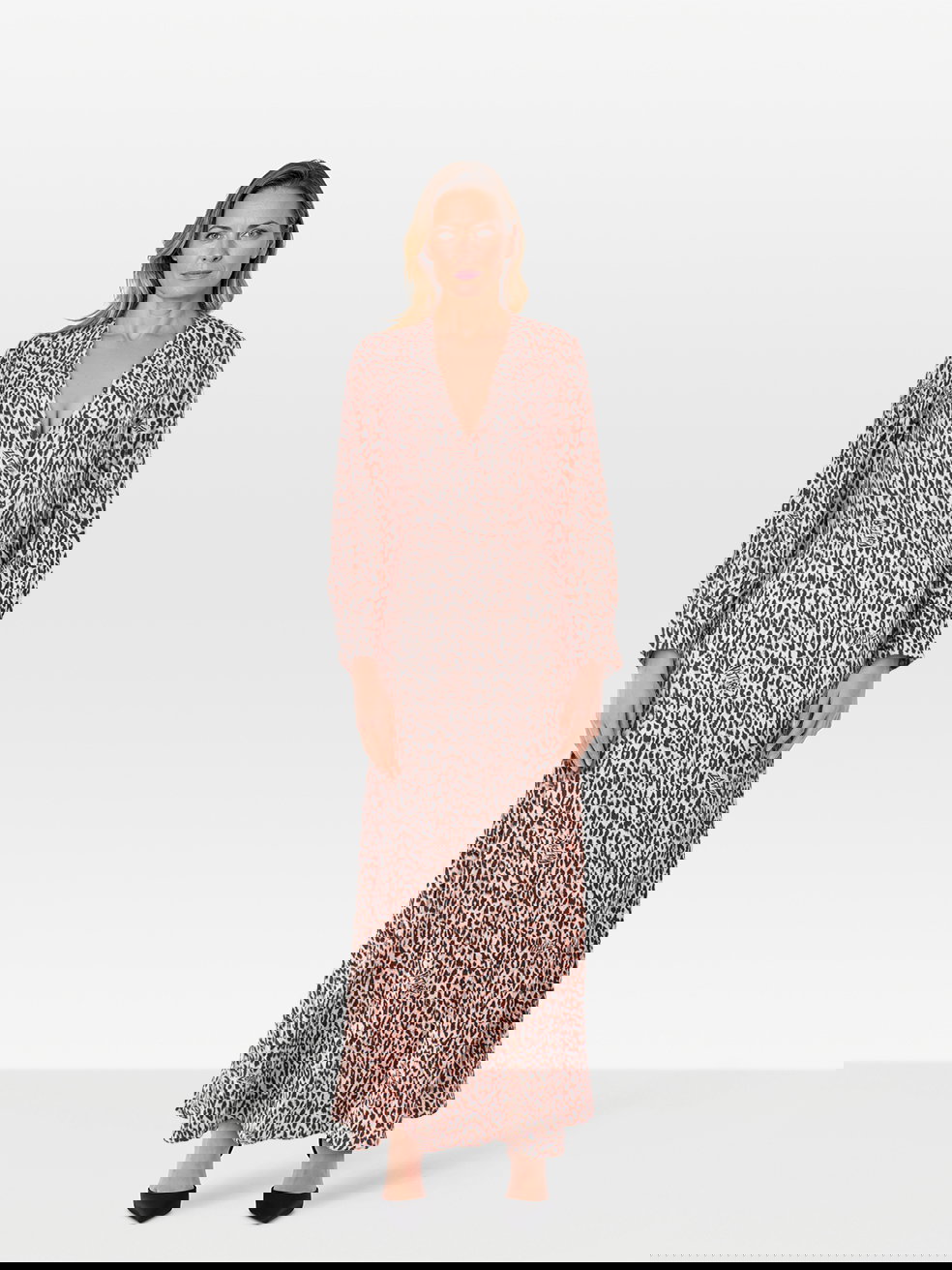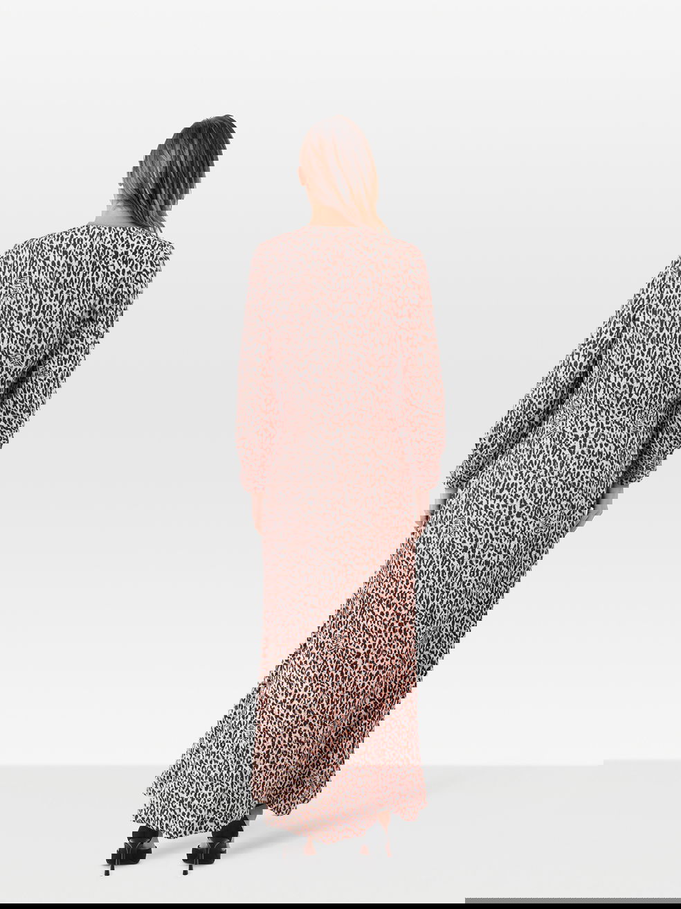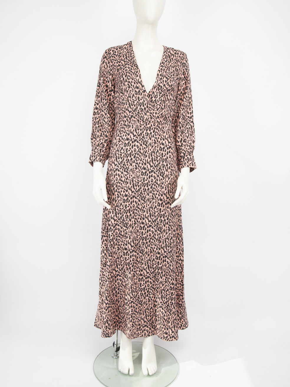 Brand new with tags pink and black leopard print dress in perfect, never worn condition. Long sleeves, v-neck. Composition: 54% silk, 46% viscose. Measurements: sleeve length: 67cm, bust: 45cm, waist: 37cm, length: 141cm.