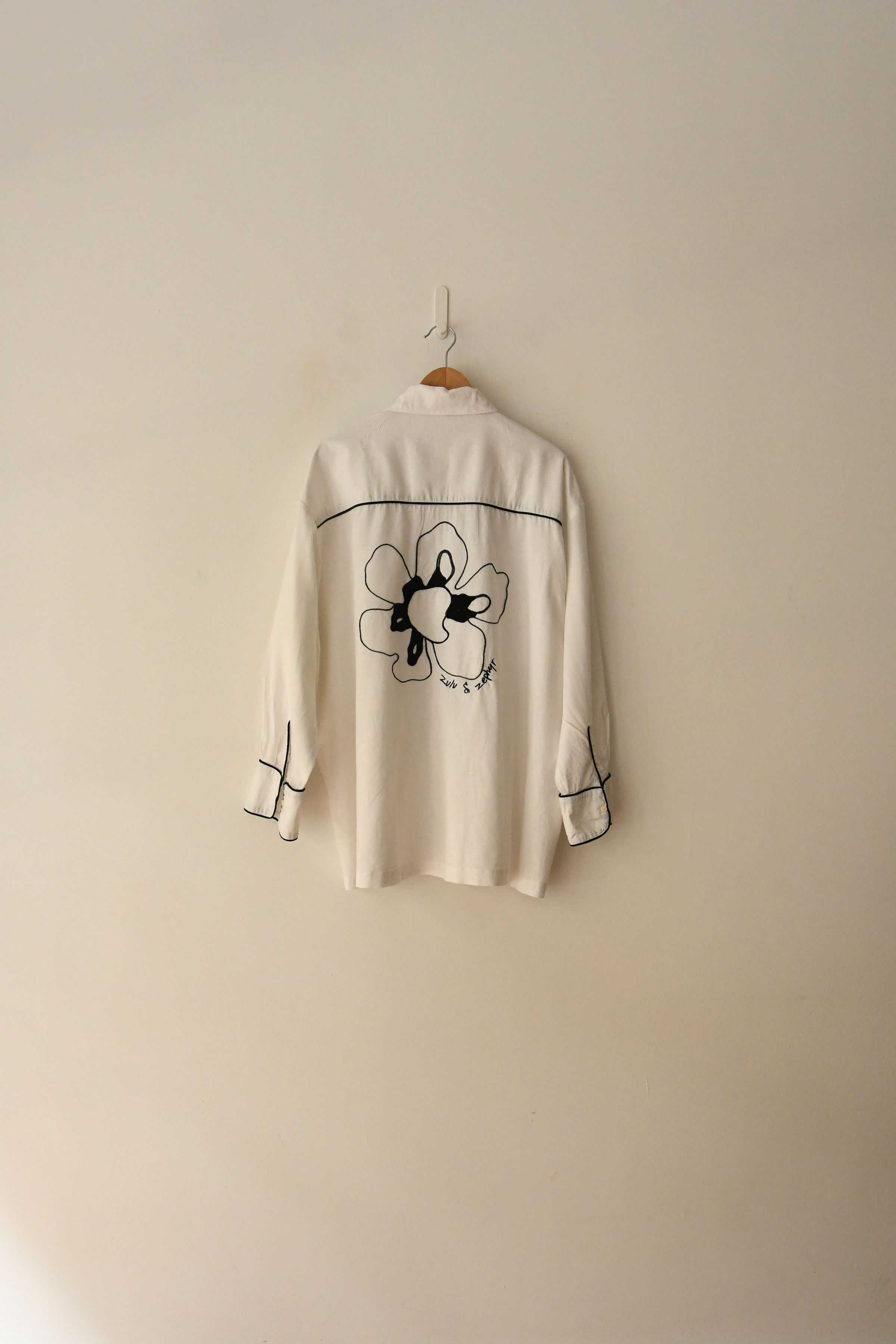 Oversized linen flower design embroidered button through shirt. Machine Washable.